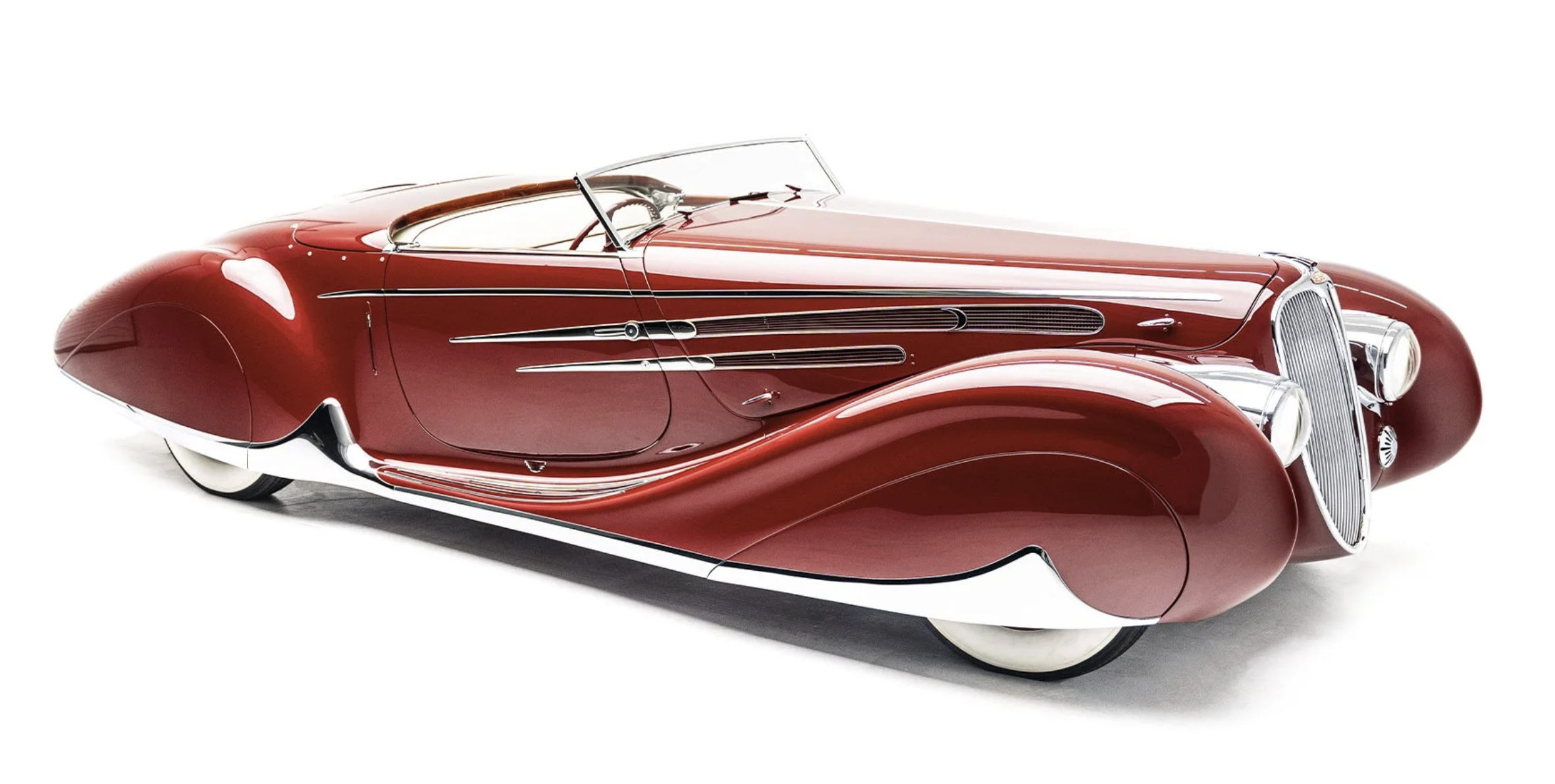 The first is a 1939 Delahaye Type 165 roadster built for the 1939 New York World's Fair by the French luxury brand and coachbuilder firm, Figoni & Falaschi. It is considered one of the finest examples of Art Deco automobile design.